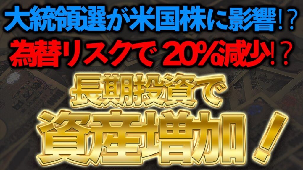 今回は、「大統領選が新NISAに与える影響とは?長期投資リスクを徹底解説」というテーマで、米国大統領選挙が新NISAや長期投資にどう影響するかを解説します! 皆さん、こんなお悩みを抱えていませんか? 「新NISAでの投資を考えているけれど、大統領選がどんな影響を与えるか不安…」 「米国株投資に興味があるけれど、為替リスクや政策の変化で資産が減るのでは?」など、心配が多いですよね。 新NISAや米国株投資をする上で、為替リスクや大統領選による市場変動リスクを放置すると例えば為替リスクで円ベースの資産が20%も下がってしまったり、また、大統領選の影響で米国株が一時的に30%以上暴落したりするリスクもあります。 -